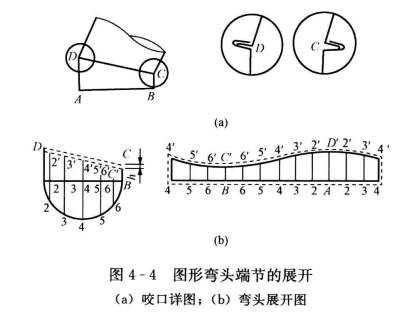 2、彎頭咬口時,搭扣緊密程度應相同,對直徑小的彎頭應當將彎頭BC’減去距離h (h通常為2mm),用BC’進行展開,如圖4-4所示。