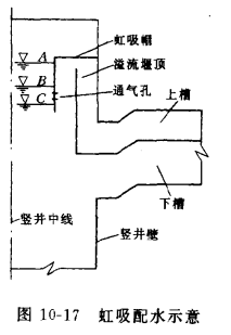 虹吸配水的原理如圖10-17所示,A,B,C三個水位時,下槽都能進水,即外區淋水。水位A時,水流通過溢流堰頂流入上槽,此時過流流態為堰流,堰頂通大氣。當堰頂空氣被水流帶走,流動變為管流,泄流水頭加大,泄流量增加。當來水流量不變時,豎井水位降低到水位B,形成虹吸。當來流量再減小,豎井水位降到C,從通氣孔向垠內通氣,虹吸破壞,上槽不再過水,變為僅外區配水。水位B還有一種工況,即流量增大,豎井水位從C增加到B,水位低于堰頂,上槽仍不進水。所以在水位B時有兩種運行情況:一種情況,上槽不進水,外區配水;另一種倩況,上槽虹吸進水,全塔配水。不用閘門,可以做到水位高于上槽(B位置),上槽仍不進水。也可通過虹吸使上槽過水,起到開啟和關閉閘門的作用,既少了閘門設備,又避免了因閘門銹蝕而造成的啟、閉困難。
