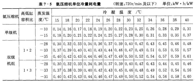 表7-5和7-6是每分鐘轉速(720轉和)960轉的氮壓縮機在各制冷系統不同冷凝溫度下生產1kW冷量的耗電定額,它是根據壓縮機的制冷量和功率計算編制的。每月終了時計算出壓縮機實際單位冷量耗電量和定額進行比較,以考核壓縮機操作管理情況。