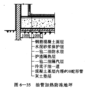 利用氮壓縮機排氣管的熱量將油加熱,用油泵將油打人地坪內的蛇形鋼管內循環流動,對地坪進行加熱防凍(也有采用乙二醉不凍液加熱的地坪防凍)。這種防凍地坪造價低,防凍性能可靠,易于管理,適用于北方寒冷地區。但施工要求嚴,油管須經試壓合格后方可安裝。在土建施工過程中,還應保護油管免受損壞。加熱油管的制作、安裝與試漏很重要。如果施工不當,造成油管漏油則很難補救。因此: