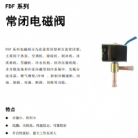 FDF系列電磁閥分為直流常閉型和交流常閉型,主要用于熱泵、空調機、除濕機、制冰機、冰淇淋機、雪融機、冷水機組、制冷壓縮機組、多并聯系統和冷凍冷藏等制冷系統中,實現分流化霜、噴氣增焓/冷卻 、控制冷媒通斷、回油、卸載、旁通、斷路、切換等功能。